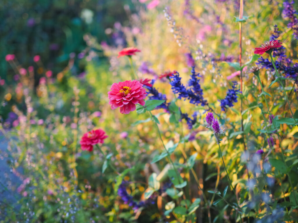 柔らかな陽光に包まれた花の庭では、ダリアやサルビアが色鮮やかに咲き誇り、