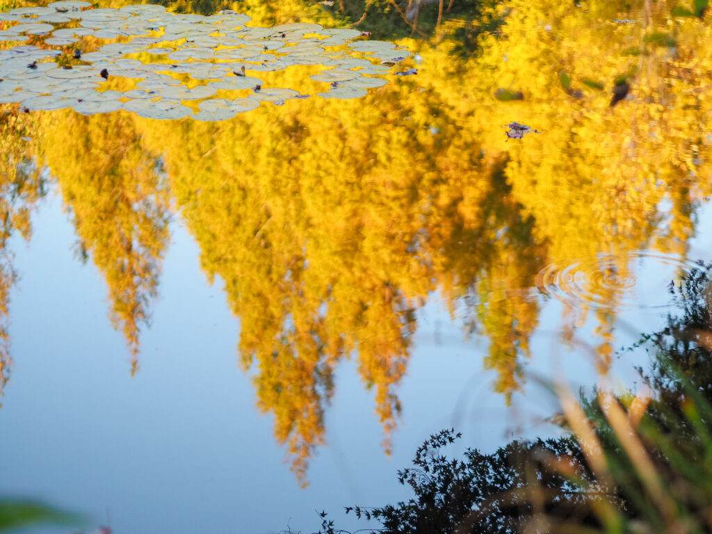 水の庭では、黄金色に染まった樹々が水面に映り込みます。