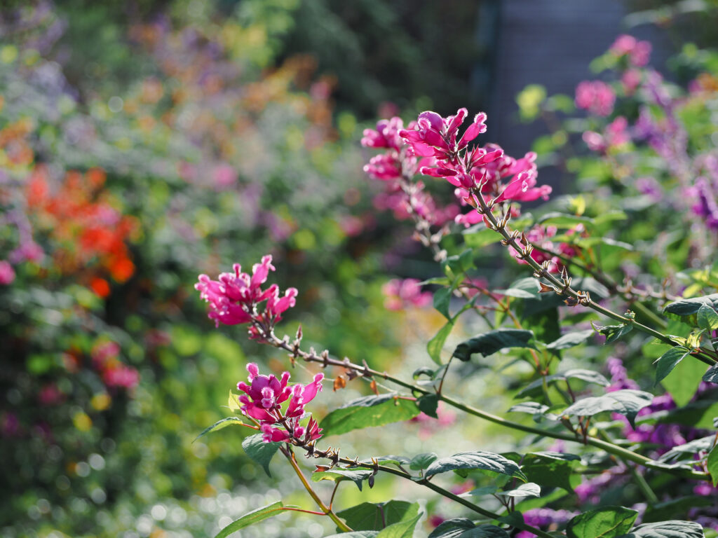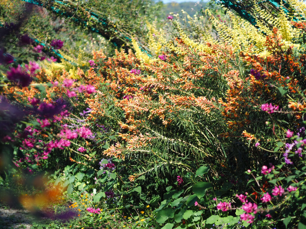 一方、「サルビア・インボルクラータ」は、透明感のある赤紫の花穂をのばし、クフェアの温かな色と呼応するように咲きます。