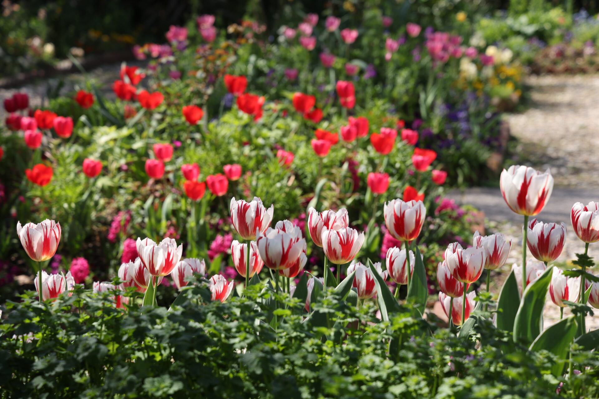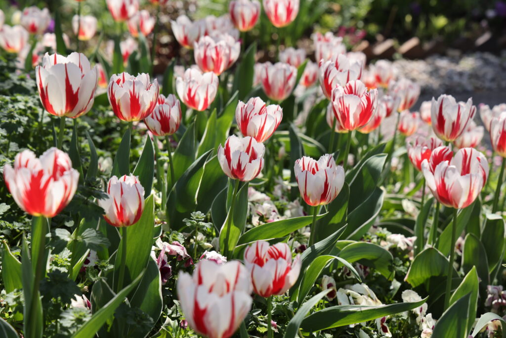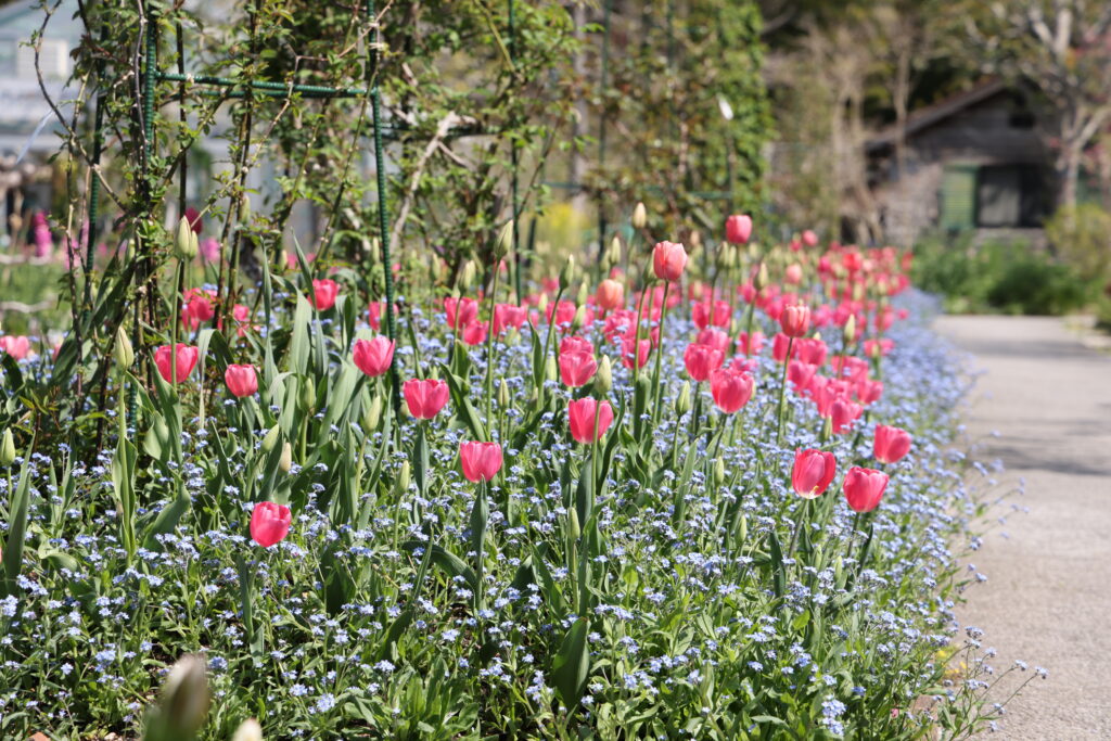 水の庭の「チューリップの丘」ではモネの絵画「睡蓮」の色彩を表現した約2万本のアイスチューリップが開花します。後期の期間には花の庭をはじめとする園内で125品種2万本のチューリップが開花します。