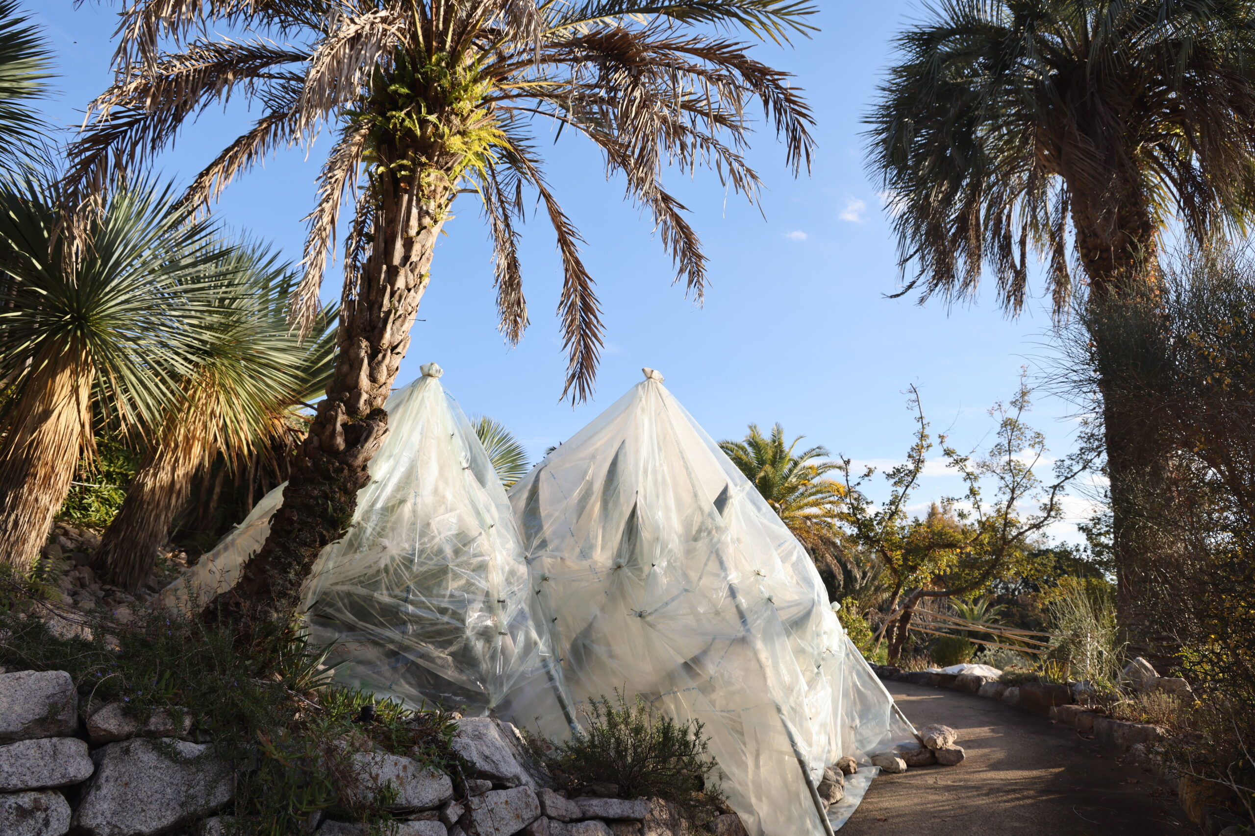 - 寒さに弱いサボテンや多肉系の植物はハウスへ移動したり、ビニールや藁で保温などします
